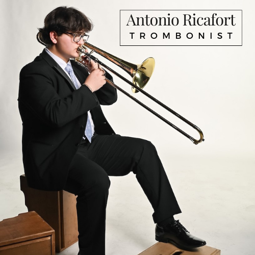 Trombonist Antonio Ricafort from Las Vegas, Nevada, began his studies on euphonium in his middle school band. He discovered the trombone and began to pursue music professionally. Antonio went to high school at The Las Vegas Academy of The Arts. In 2022, under the direction of John Seaton and David Maccabee, the Las Vegas Academy Wind Ensemble had the opportunity to play at The International Band and Orchestra Midwest Clinic in Chicago. During his time at the Academy, The Wind Ensemble worked with various professionals, such as Timothy McAllister and the Epoch Percussion Quartet.